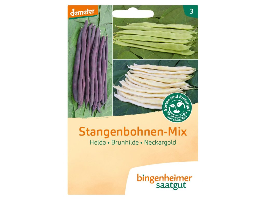 Barevná směs tří osvědčených odrůd fazolí pro venkovní pěstování, s vysokým výnosem a bez vláken. Lusky jsou k dispozici v barvách zelené (Helda), modré (Blauhilde) a žluté (Neckargold). Fazole vysévejte ne příliš hluboko a až po pozdních jarních mrazech, do dobře prohřáté půdy.